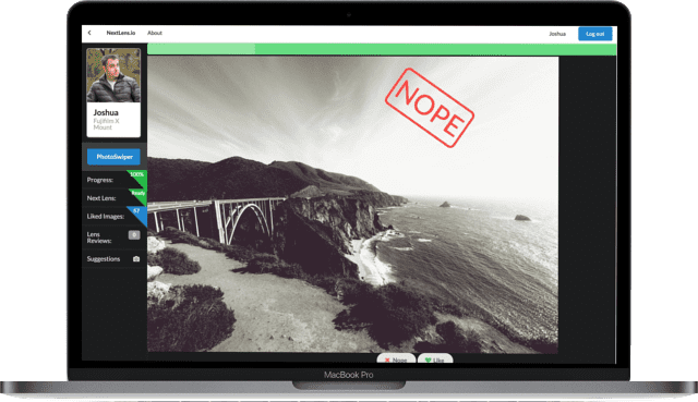 Features: Swipable images to like/dislike an image (I.E Tinder swipes) Helps photographers find lenses that will deliver images of their preference Integrates with FlickR API to show real images taken with specific lenses